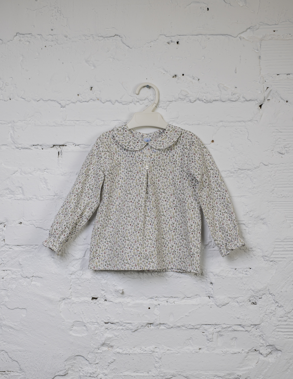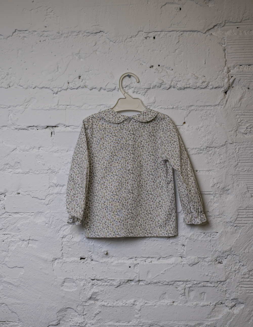 En el caso de esta camisa, los detalles son el cuello bebé en el escote ribeteado con el mismo tejido, y manga larga con goma terminando en volante, para que se pueda adaptar a cada bracito.