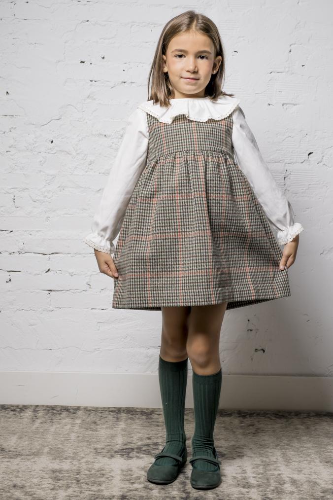 Diseñado con un corte cómodo y favorecedor, incorpora apertura trasera para facilitar el vestir y el movimiento de las niñas, manteniendo siempre la estética cuidada y sofisticada. Perfecto para combinar con camisas de cuello volante, leotardos y chaquetas de punto, creando conjuntos únicos para el día a día o para ocasiones especiales.