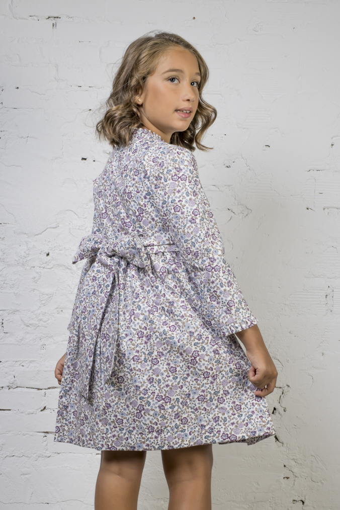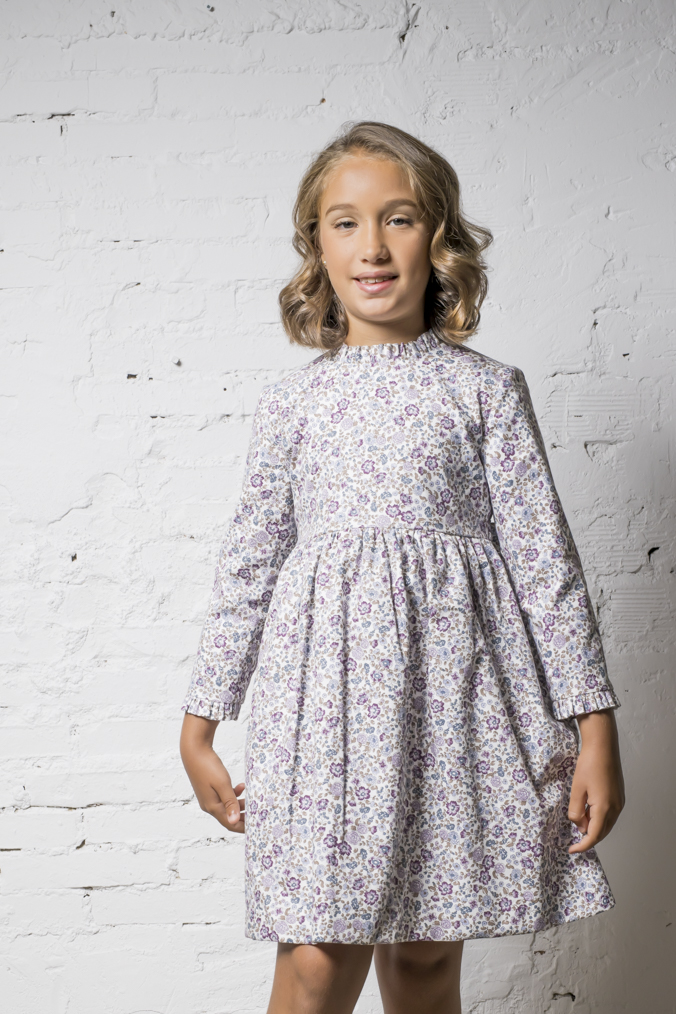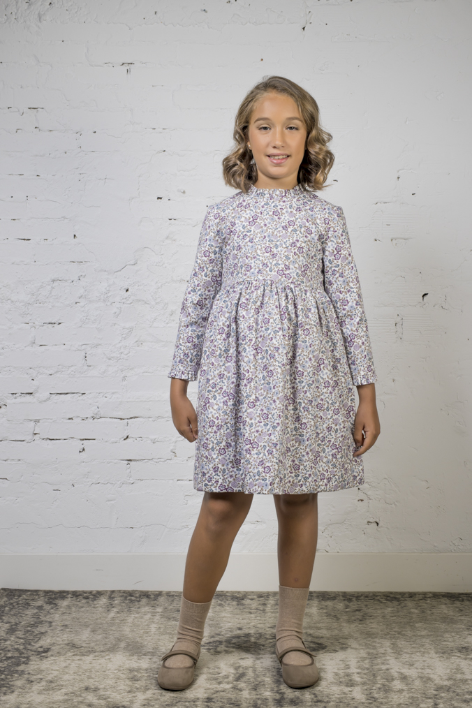 Delicado y atemporal, este vestido de corte básico está confeccionado en viyela estampada con flores Liberty en tonos malva. Su diseño destaca por los volantes dobles del cuello, orientados hacia arriba, que aportan un toque elegante y romántico. La manga francesa le da un aire distinguido y cómodo para los meses más frescos, mientras que la lazada trasera permite ajustar el vestido para un outfit perfecto y favorecedor. Totalmente forrado para garantizar suavidad y un acabado impecable.