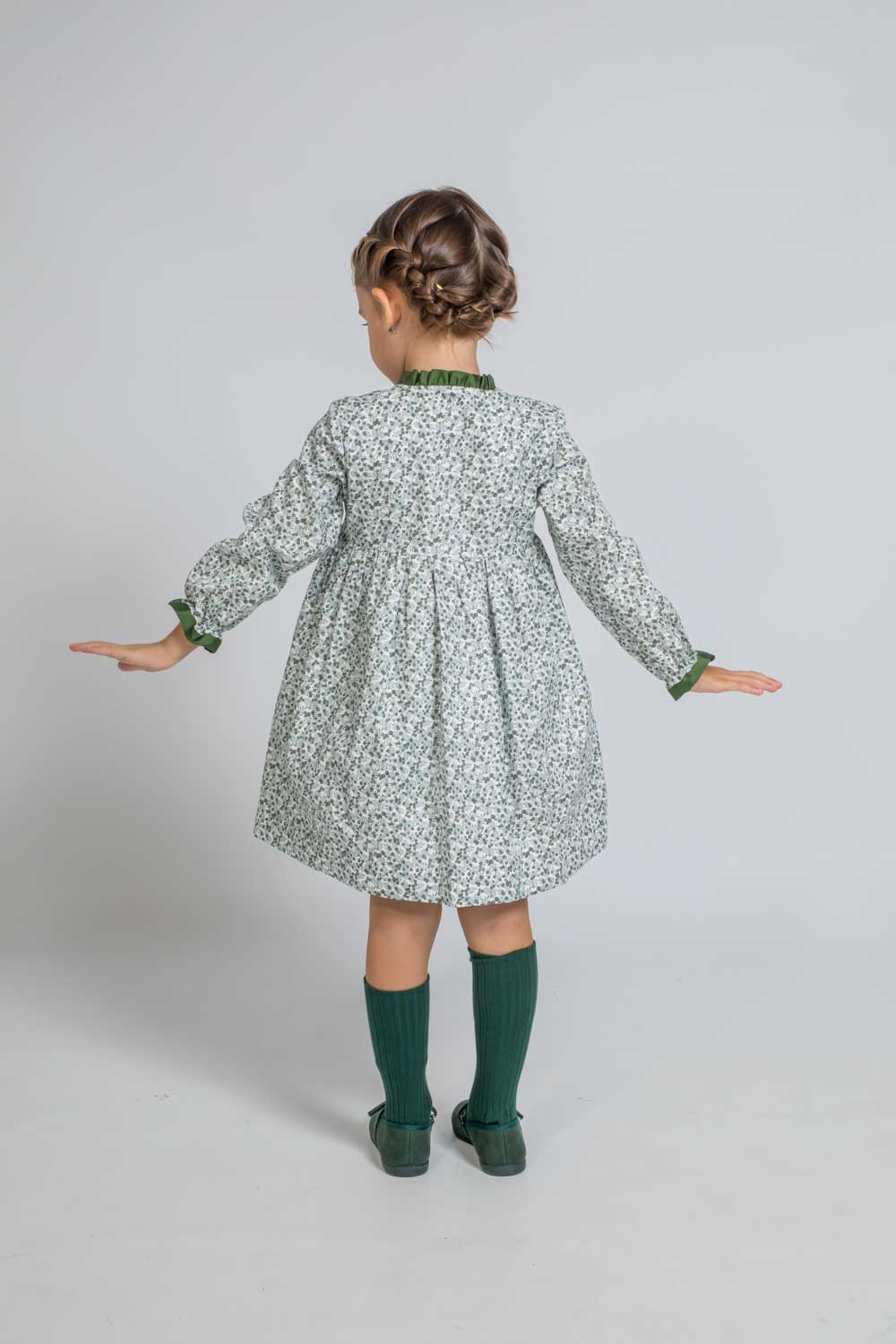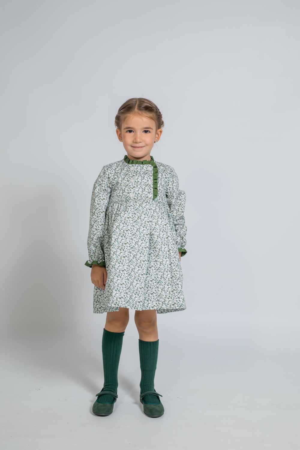 Vestido de viyella olive C23-7 cruzado en el delantero, adornado con lazo falla verde oscura. Manga larga. Forrado.