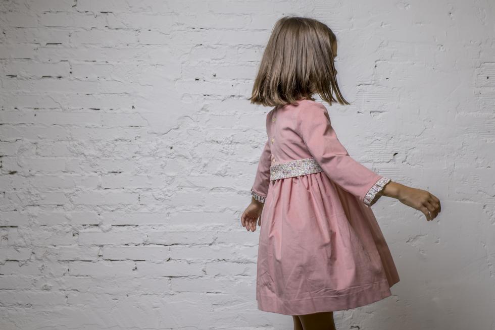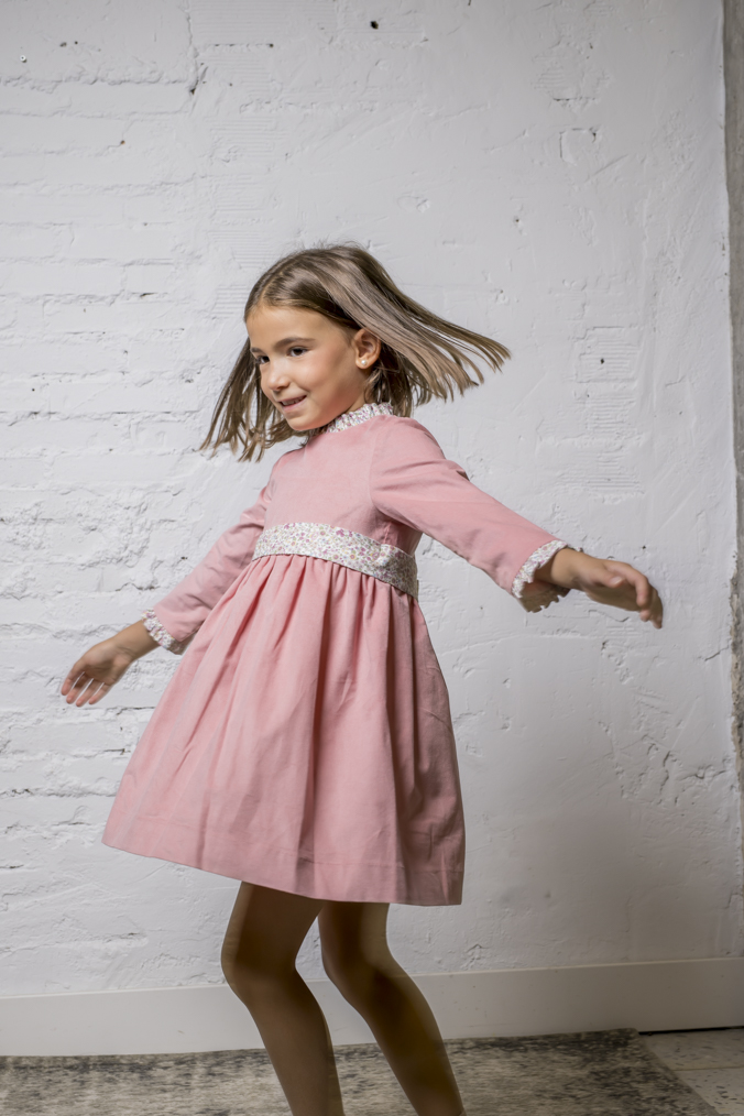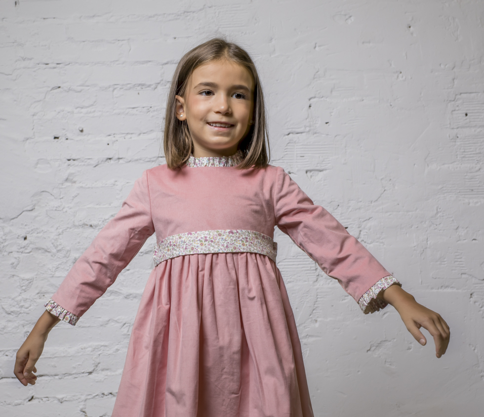 Vestido de niña de micropanita, combinado con volantes y cinturón estampados. Diseño atemporal que gusta por su funcionalidad y que es muy práctico para una ocasión especial. El vestido está forrado, para evitar molestias en las niñas.