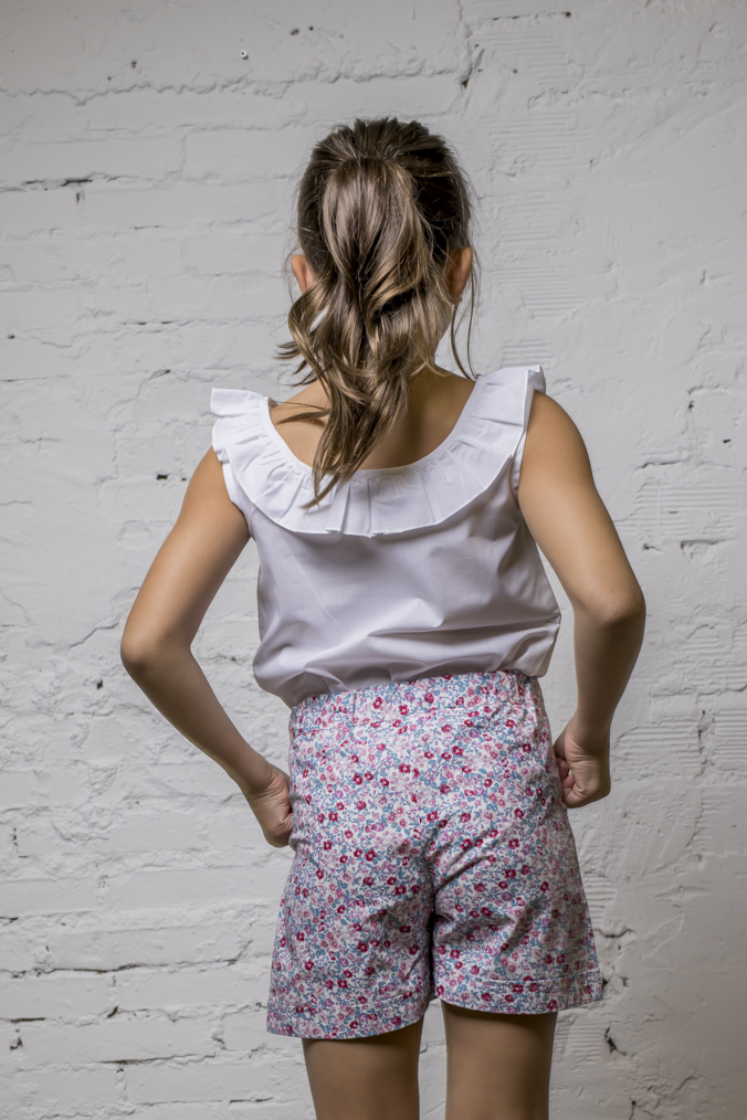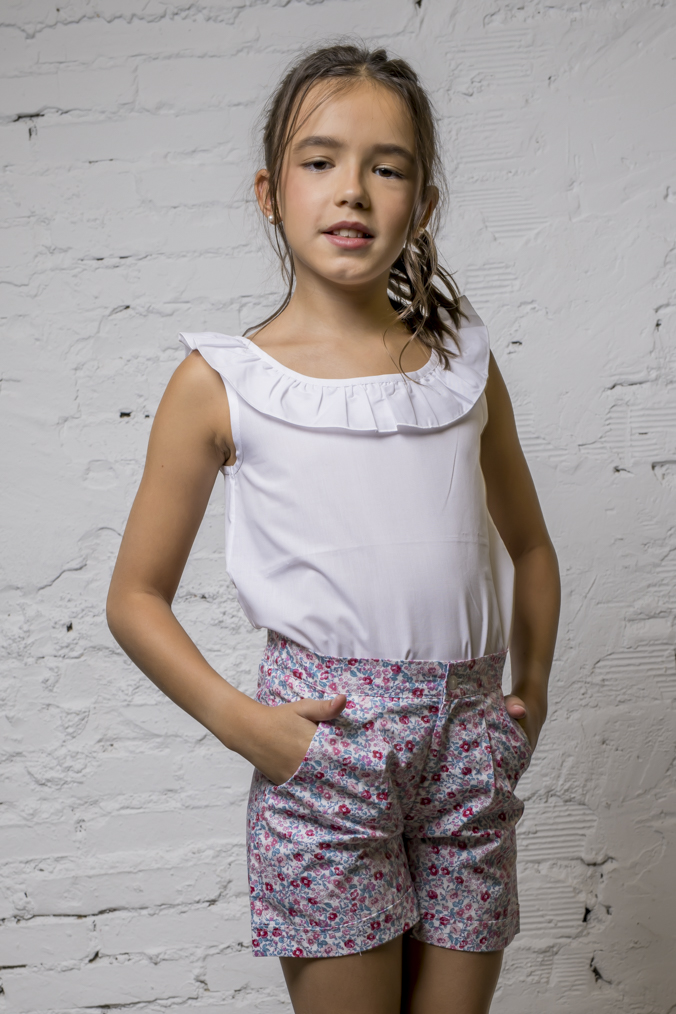 Pantalón de niña con bolsillos y doblez en la pierna. Ideal para el verano por su frescura y comodidad. Combinado con una camiseta o una camisa de color liso, consigues un conjunto de verano inigualable.