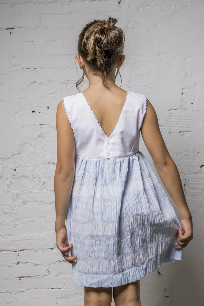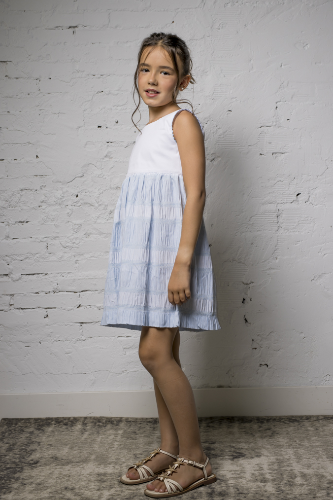 Vestido fresco y veraniego, con el cuerpo confeccionado de piqué blanco adornado con picunela celeste, y la falda de bambula fresca y cómoda.