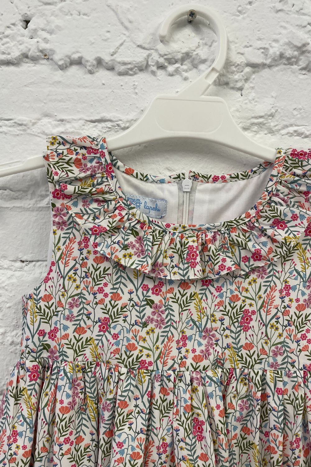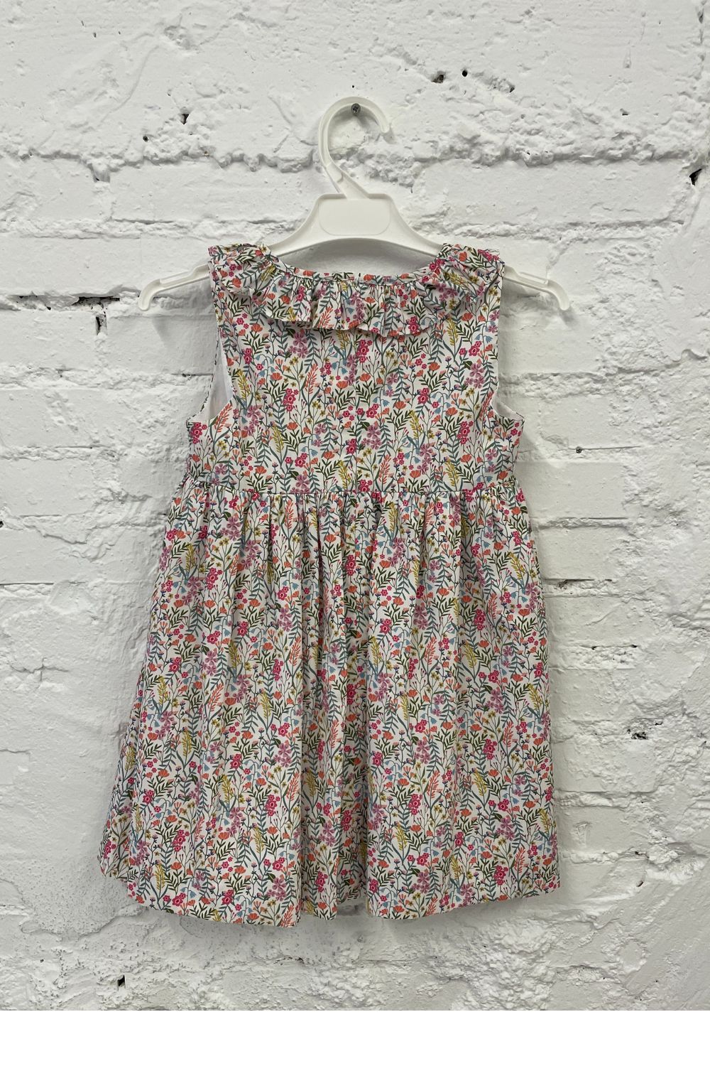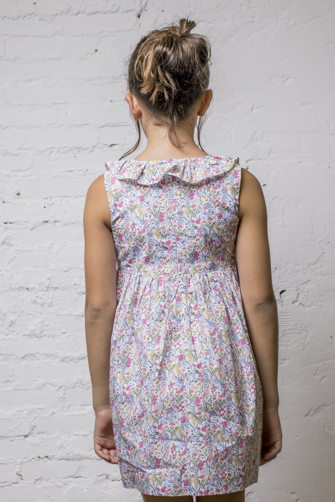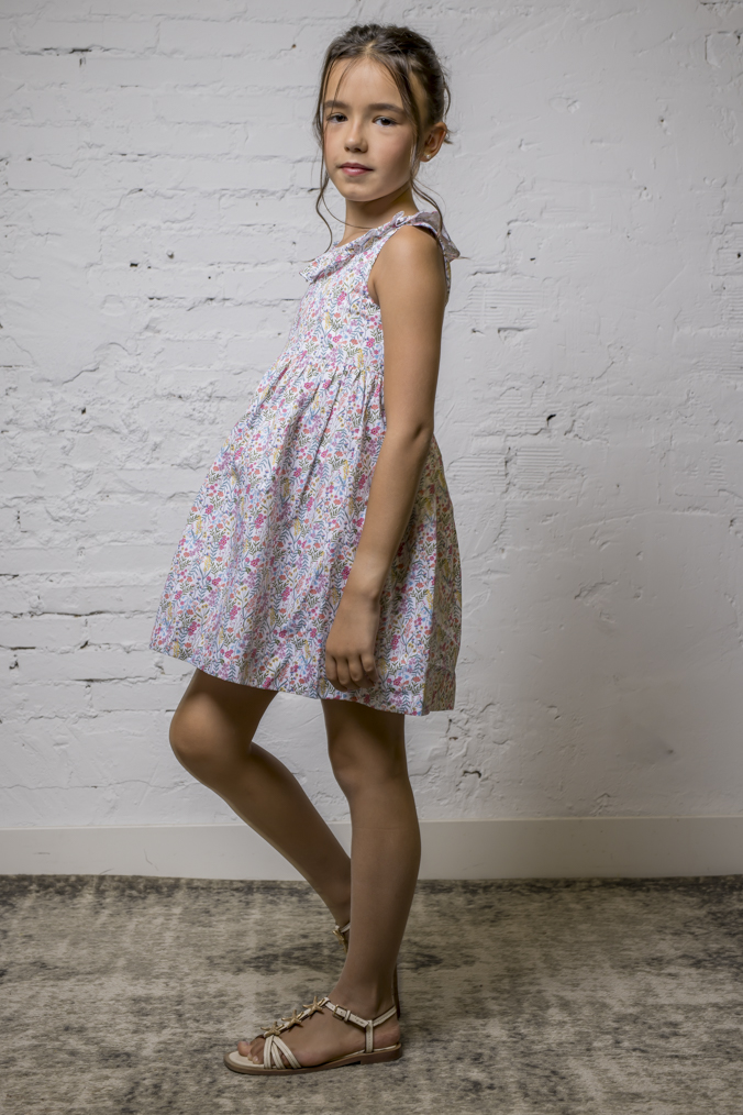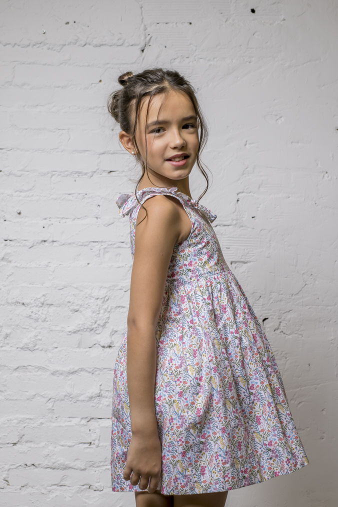 Vestido muy favorecedor para el verano, con su escote más abierto para no agobiar a las niñas, sin mangas, y volantón en escote, de manera que van cómodas y guapísimas en verano. Es un modelo de vestido fresco, alegre y muy ponible, al poder usarlo tanto de mañana como de tarde.